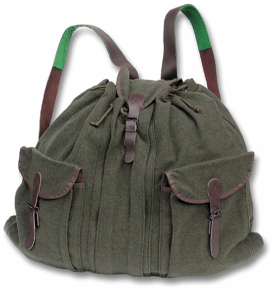 Loden Roesack- Loden Cloth with Leather Trim- x 3 Front Pkts- Removable Wasdhable Liner- Adjustable Shoulkder Strap- Taped seams- size 57 x 63 cm
