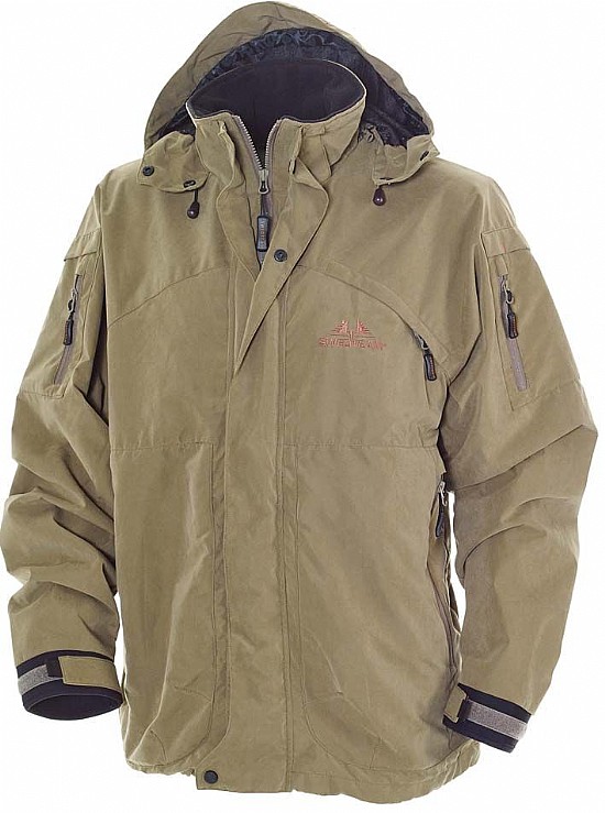 Swedteam Hambra Mens Green Jacket - Green "Lightweight" waterproof/Breathable Long Shooting Walking Jacket- NEW for 2016- Multi pockets + Zipped detachable hood - Hybrid Garment where areas are waterproof where you need it and water resistant where breathability is the key - internal draw cord- Adjustable neoprene type cuffs+ Fantastic value Sizes 36-48